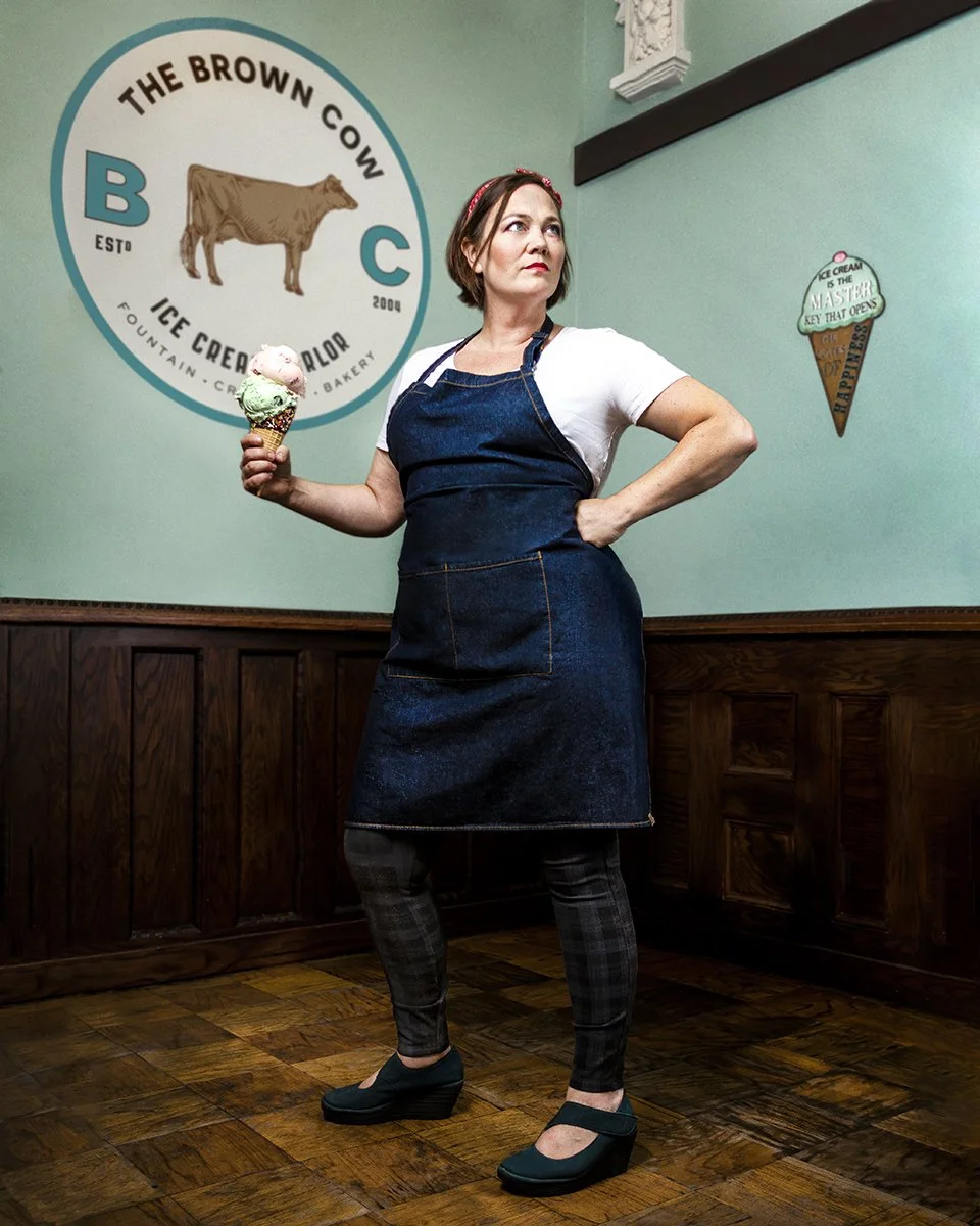 This Modern Rosie power portrait from 2018 shows Connie looking to her future, holding a cone of two of her favorite flavors under her powerful brand. While Connie has moved on from owning and working on Brown Cow, her economic and community influence will forever be felt.