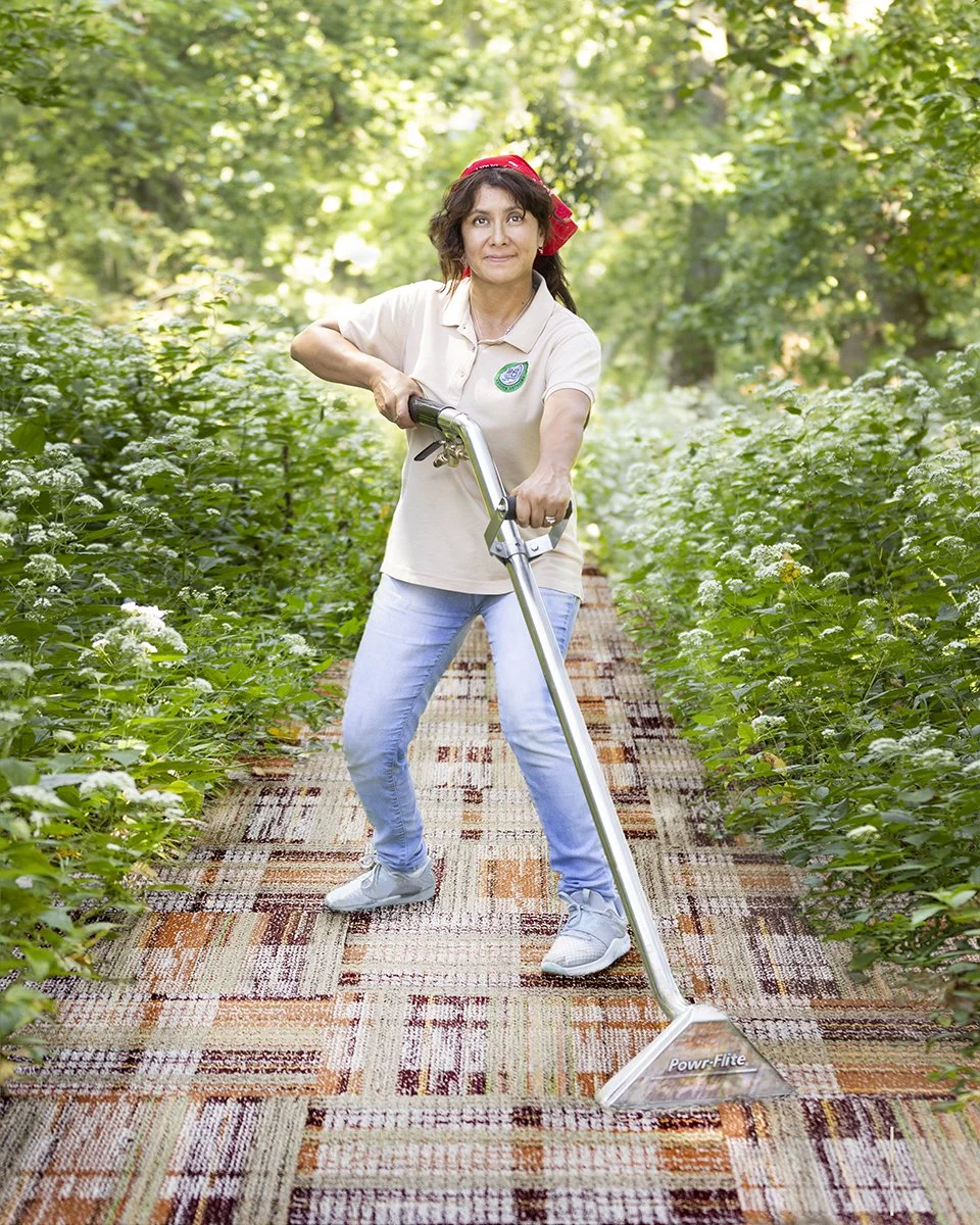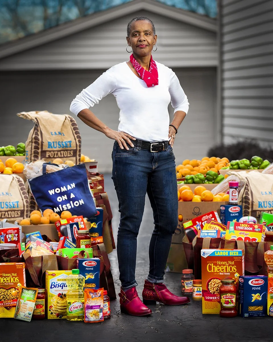 Ann’s Modern Rosie portrait is set in her home’s driveway, the organization’s original staging point for distribution of labeled foodbags to drivers who are matched with families in need. The goods surrounding her are a small sample of items they receive through donations, grants, and local grocery stores. Ann purchased the badass boots to represent her southern roots.